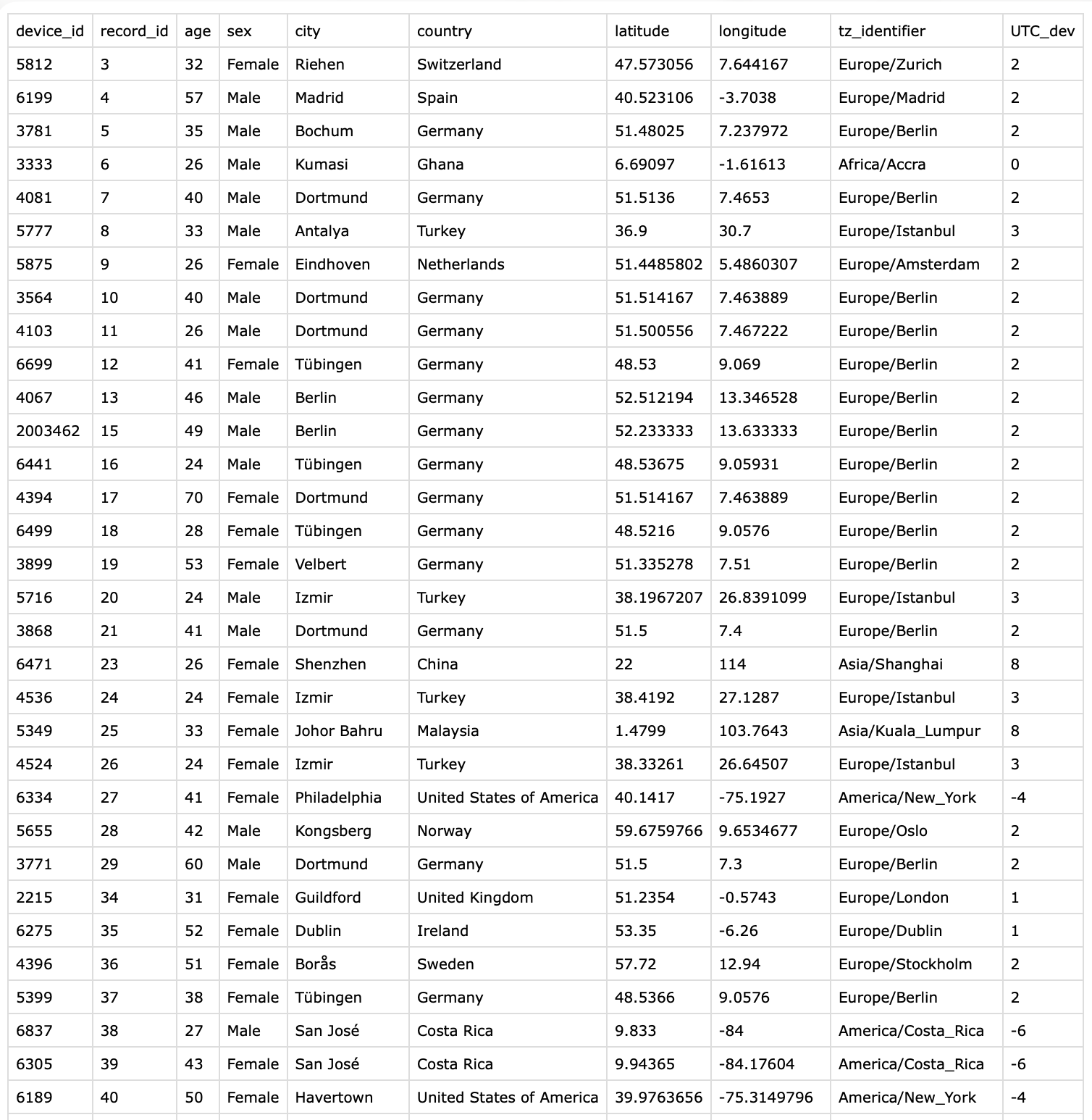 Why is that? local_time can be expected, we set it ourselves above. But why is Datetime now converted to Europe/Zurich. Looking at the first row of the participant data, we see that this is the time zone of the first participant: