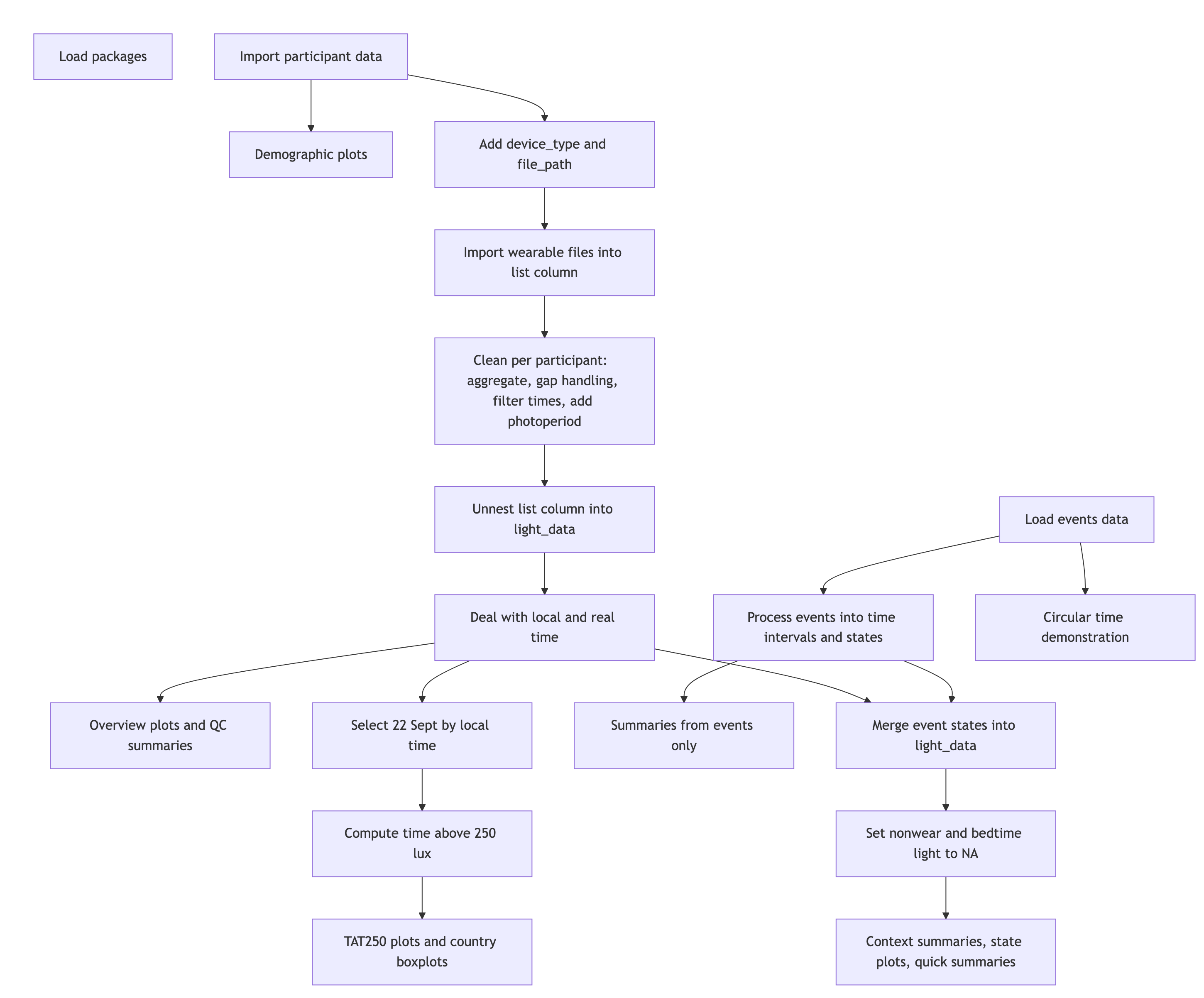 On the September 2025 equinox, over 50 participants across the globe logged and annotated their daily light exposure. While not a (traditional) study, the data is extraordinarily well suited to explore a diverse dataset across many participants in terms of geolocation, device-type, and contextual information, as participants logged their statechanges via a smartphone application. The dataset were analysed and presented as part of the A Day in Daylight event on 3 November 2025. They can be explored in an interactive dashboard. For this use case, we will take a subset of the datasets to explore workflows for these conditions, and summarize the data by combining it with activity logs and participant demographics.