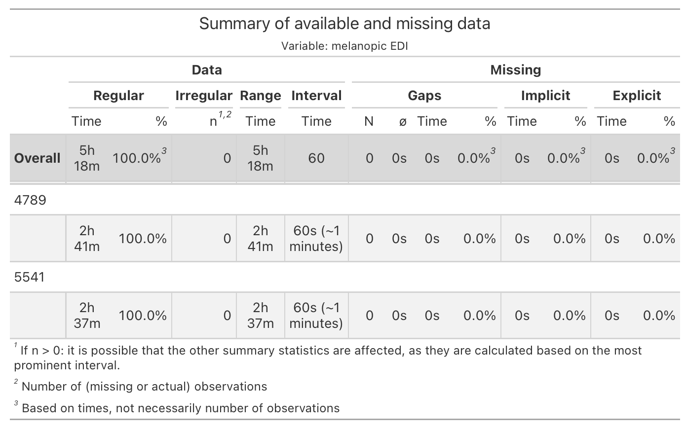 This section serves to create a fully code-based tabular overview of the data. First, we need to collect the data in the necessary format. Here, one important question arises. Because of the interruptions, no participant has a singular period for all three conditions (pre, light, post). Depending on the LightLogR functions we use, we can either calculate key metrics for all times a certain state is active (by state), or by each episode a certain state is active (by episode). In our case, the by state approach is the better one, but we will highlight both workflows here: