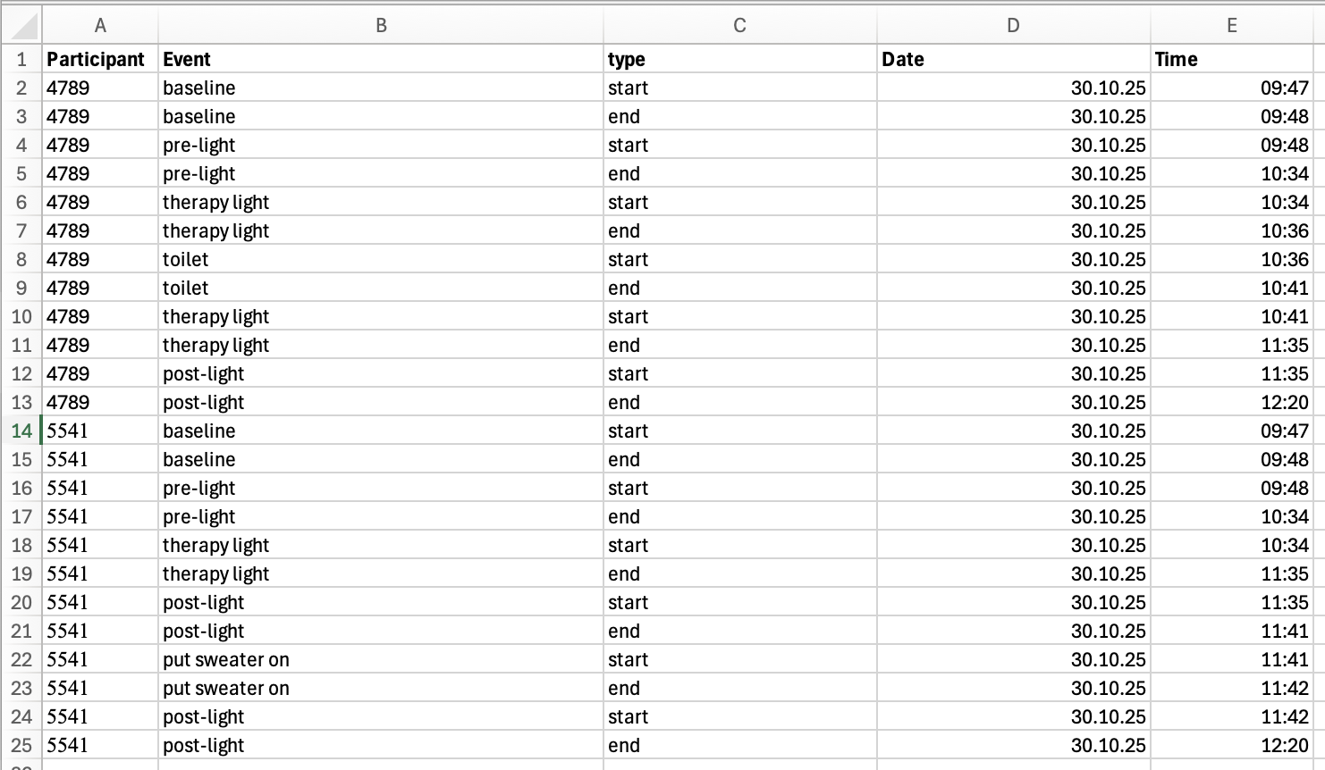 Participant logs are stored in a consolidated Excel file. Figure 2 shows the contents of the files when opened in Excel.