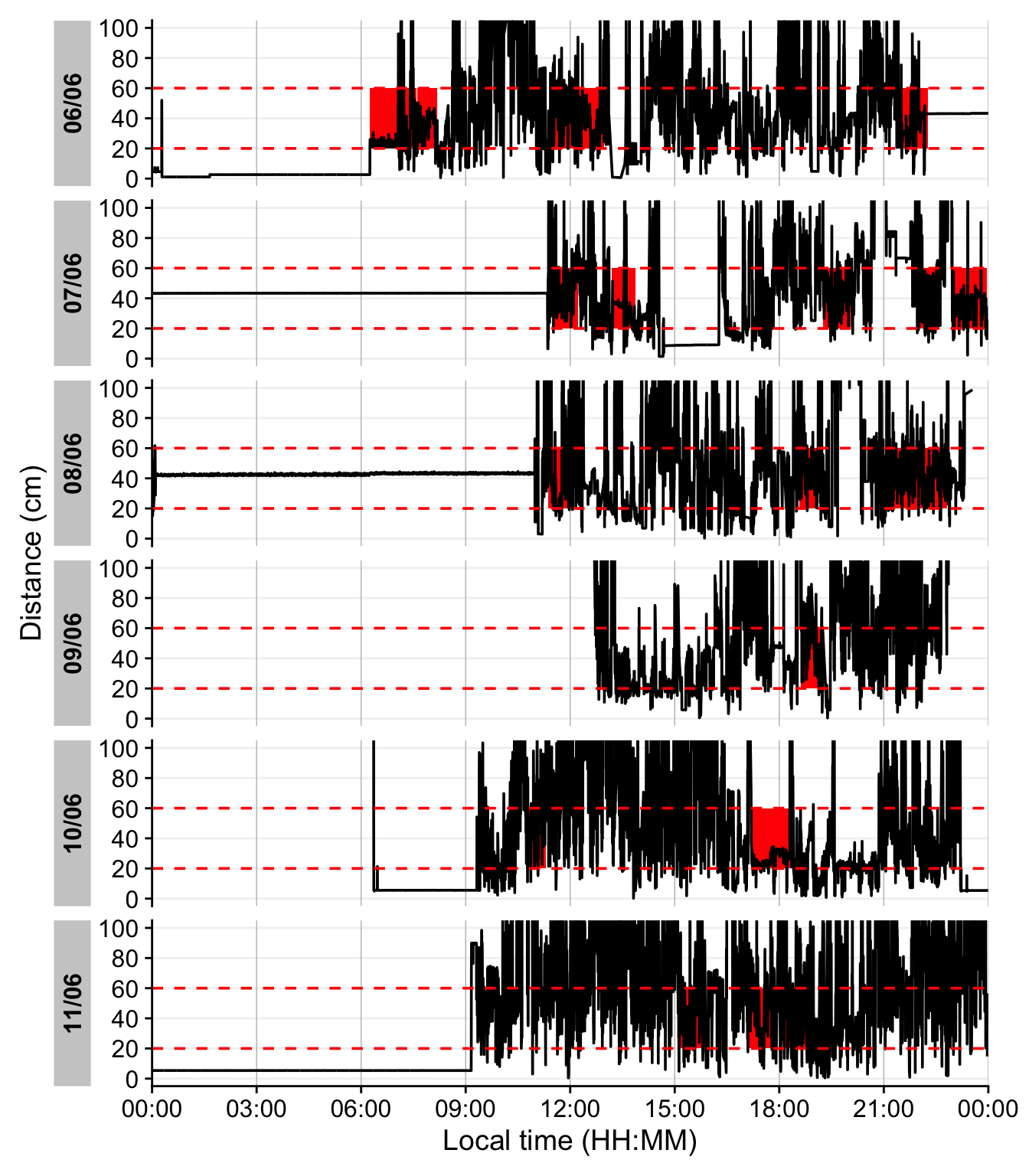 The last figure showcases a serious issue. During the nighttime, when the device is not worn, it records distance values in the area of interest. To get rid of these values, we remove times with low variance, based on a sliding window of 10 minutes. Let us first determine what such a value would look like.