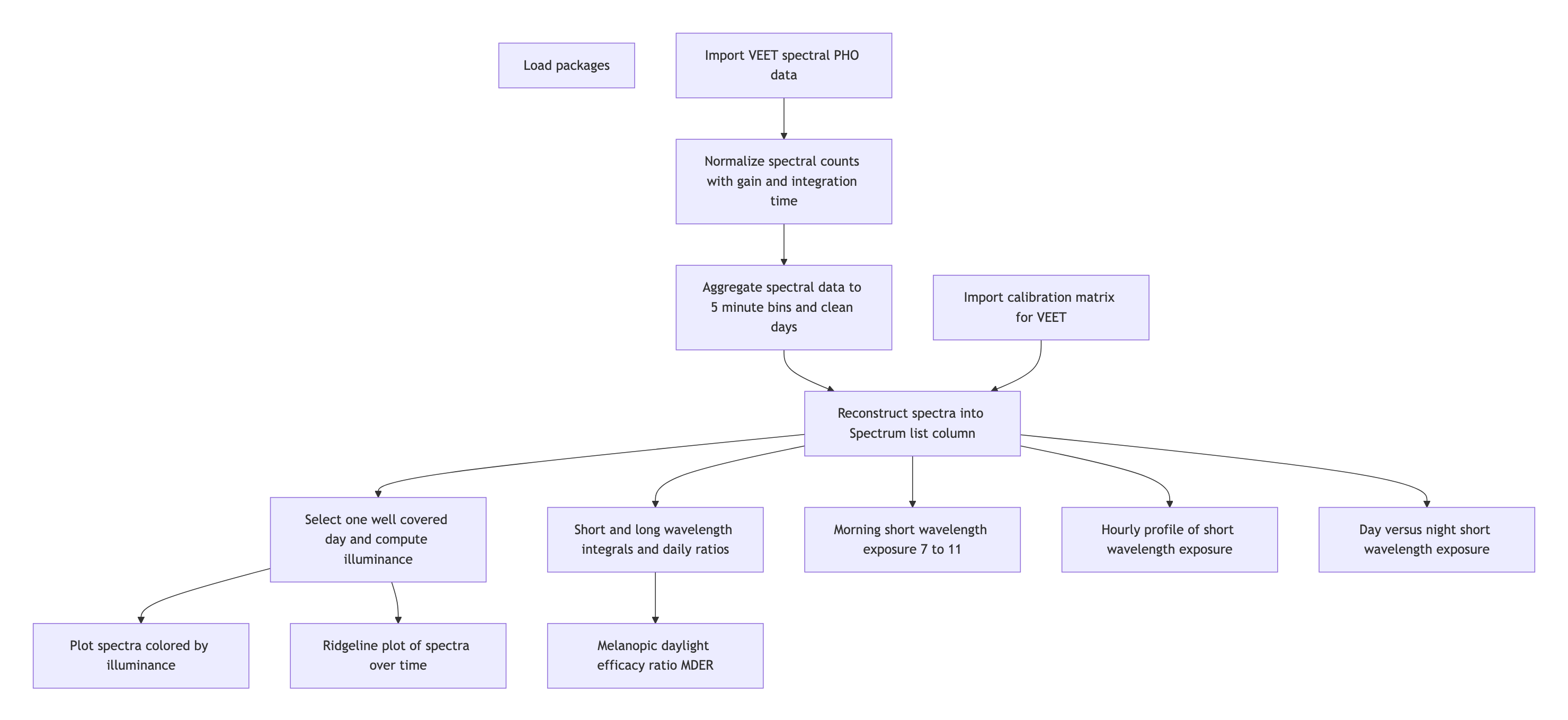 In the VEET’s export file, each line includes a timestamp and a modality code, followed by fields specific to that modality. Importantly, this means that the VEET export is not rectangular, i.e., tabular. The non-rectangular structure of the VEET files can be seen in Figure 2 to the side. This makes it challenging for many import functions that expect the equal number of columns in every row, which is not the case in this instance. For the PHO (spectral) modality, the columns include a timestamp, integration time, a general Gain factor, and nine sensor channel readings covering different wavelengths (with names like s415, s445, ..., s680, s940) as well as a Dark channel and a broadband channels Clear. In essence, the VEET’s spectral sensor captures light in several wavelength bands (from ~415 nm up to 940 nm, plus an infrared and “clear” channel) rather than outputting a single lux value like the ambient light sensor does (PHO). Unlike illuminance, the spectral data are not directly given as directly interpretable radiometric metrics but rather as raw sensor counts across multiple wavelength channels, which require conversion to reconstruct a spectral power distribution. In our analysis, spectral data allow us to compute metrics like the relative contribution of short-wavelength (blue) light versus long-wavelength light in the participant’s environment. Processing this spectral data involves several necessary steps.